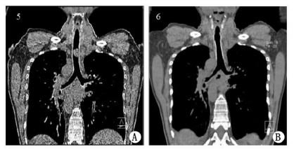 图 2 A:术前胸部CT平扫加重建示,胸廓入口处T2椎体水平食管左侧肿块,侵犯前方并向气管内生长,气管腔部分狭窄。B:术后第3天胸部CT平扫加重建示,气管内占位已未见,气管支架植入,气管腔通畅,未见明显狭窄或新生物。