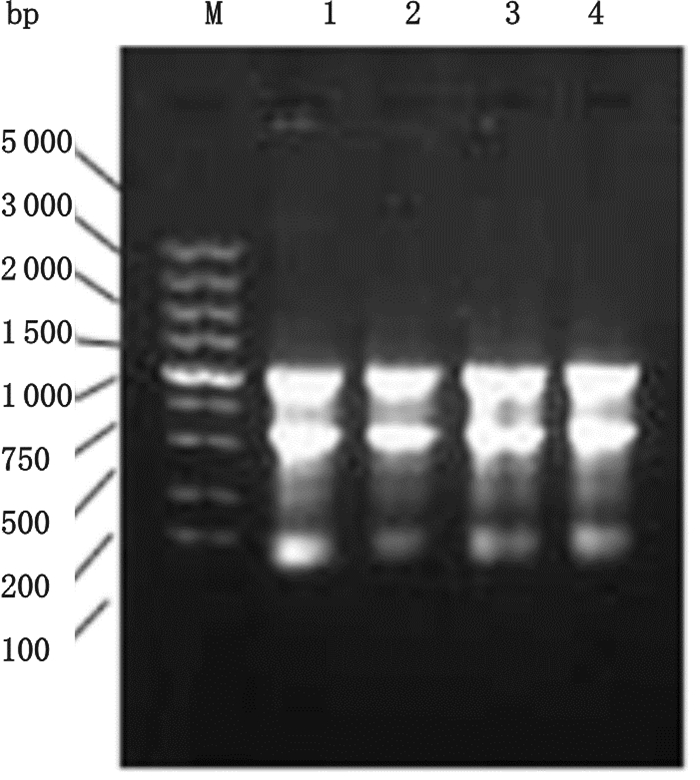 M:DNA相对分子质量标准品;1:正常组;2:假手术组;3:新疗法组;4:对照组 图 1 肝脏组织总RNA电泳结果 Fig 1 Total RNA extracted from liver tissue