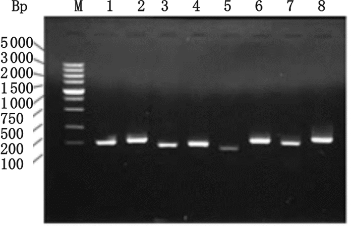 M:DNA相对分子质量标准品;1:F Ⅱ;2:F Ⅶ;3:FⅨ;4:F Ⅹ;5:F Ⅺ;6:F Ⅻ;7:F Ⅷ;8:GAPDH 图 2 凝血因子基因定量PCR扩增结果 Fig 2 Real-time PCR products of coagulation genes