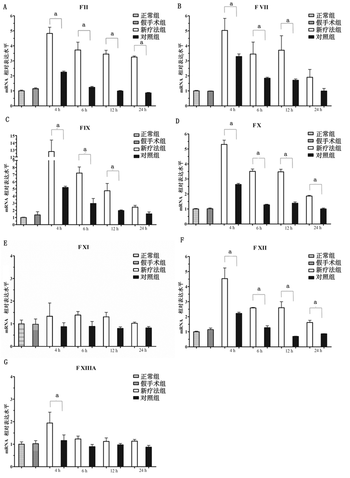 对新疗法组与对照组的凝血因子基因mRNA表达变化进行比较后发现,在本研究检测的7个凝血因子基因中,凝血因子F Ⅱ,F Ⅹ与F Ⅻ在伤后4 h至24 h所有时间点,新疗法组均高于对照组,其差异具有统计学意义(P<0.05);而凝血因子F Ⅶ与F Ⅸ在伤后4 h至12 h,新疗法组显著高于对照组(P<0.05),而在伤后24 h,新疗法组与对照组差异无统计学意义(P>0.05);凝血因子F XIII A亚基在伤后4 h,新疗法组显著高于对照组(P<0.05),而伤后6 h至24 h,新疗法组与对照组差异无统计学意义(P>0.05);凝血因子FⅪ在伤后4 h至24 h,新疗法组与对照组均差异无统计学意义(P>0.05)。