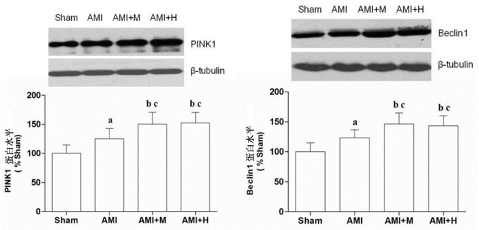 与Sham组比较,AMI、AMI+M和AMI+H组PINK1和Beclin1表达显著升高(P<0.05或P<0.01)。与AMI组比较,AMI+M和AMI+H组PINK1和Beclin1表达显著升高(P<0.05),见图 1。