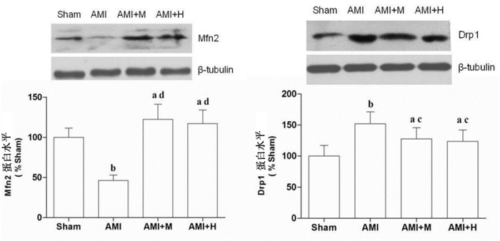 与Sham组比较,AMI组Mfn2表达显著降低(P<0.01),Drp1表达显著升高(P<0.01),AMI+M和AMI+H组Mfn2和Drp1表达均显著升高(P<0.05)。与AMI组比较,AMI+M和AMI+H组Mfn2表达显著升高(P<0.05),Drp1表达显著降低(P<0.05),见图 2。