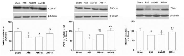 与Sham组比较,AMI和AMI+M组Tfam、COXⅣ和PGC-1α表达均显著降低(P<0.05或P<0.01)。与AMI组比较,AMI+M组PGC-1α表达显著升高(P<0.05),AMI+H组Tfam、COXⅣ和PGC-1α表达均显著升高(P<0.05或P<0.01)。与AMI+M组比较,AMI+H组Tfam、COXⅣ和PGC-1α表达均显著升高(P<0.05),见图 3。