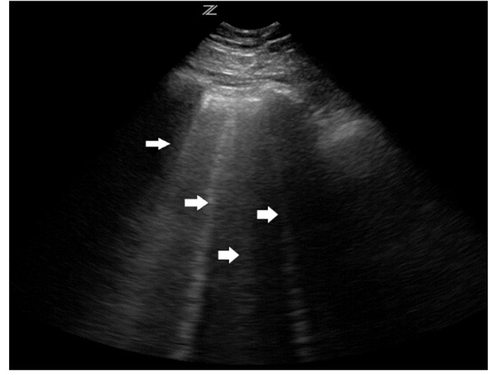 | 图 1 肺脏超声声像图示B线(箭头示) |