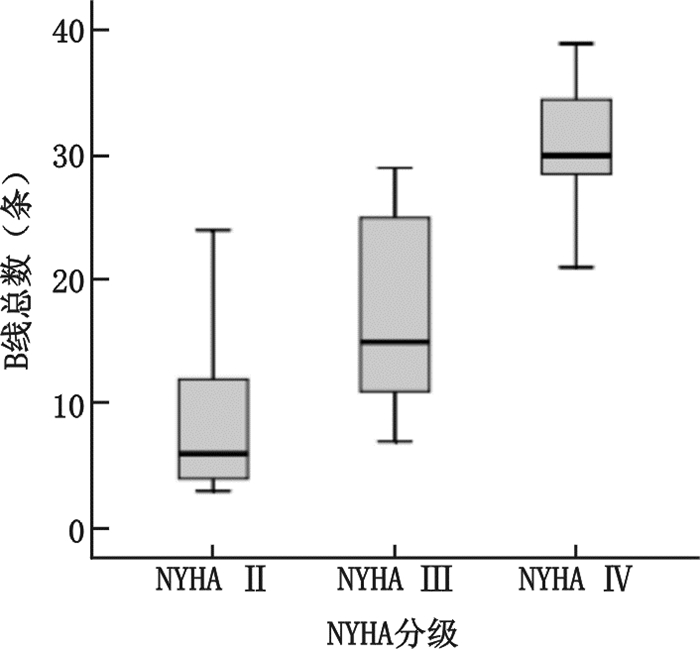| 图 2 Ⅰ组B线总数随纽约心功能分级的变化 |