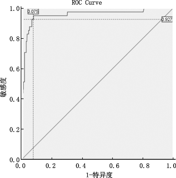 2.4 受试者工作特征(ROC)曲线依据中国心力衰竭诊断和治疗指南2014[1]将患者分为心源性呼吸困难组(Ⅰ组)及肺源性呼吸困难组(Ⅱ组),将Ⅰ组的B线总数作为阳性组,Ⅱ组的B线总数作为阴性组绘制ROC曲线(图 3)。曲线下面积为0.933(0.881~0.985)。其中根据约登指数(Youden’ s index)所确定的诊断临界值为>8条,具有较高的敏感度(81%)和特异度(89%),当特异度达到100%时的诊断临界值为>15条,此时敏感度较低,为58%。