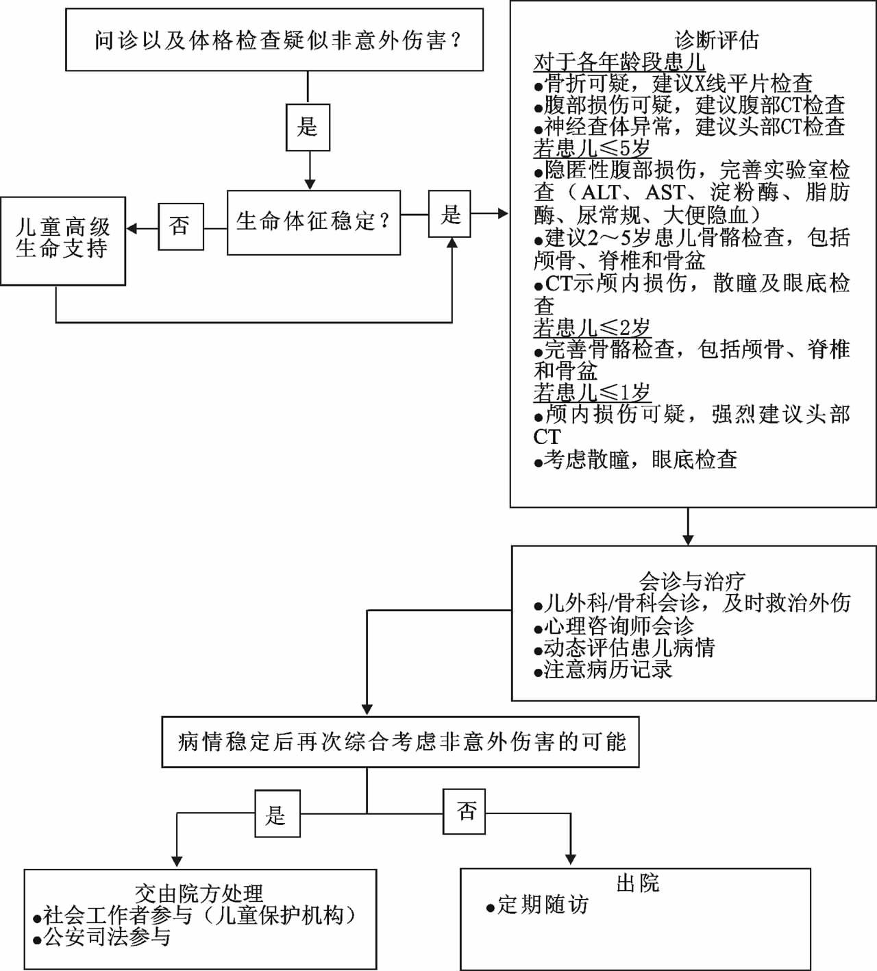 | 图 2 儿童非意外伤害可疑病例的临床处理流程 |