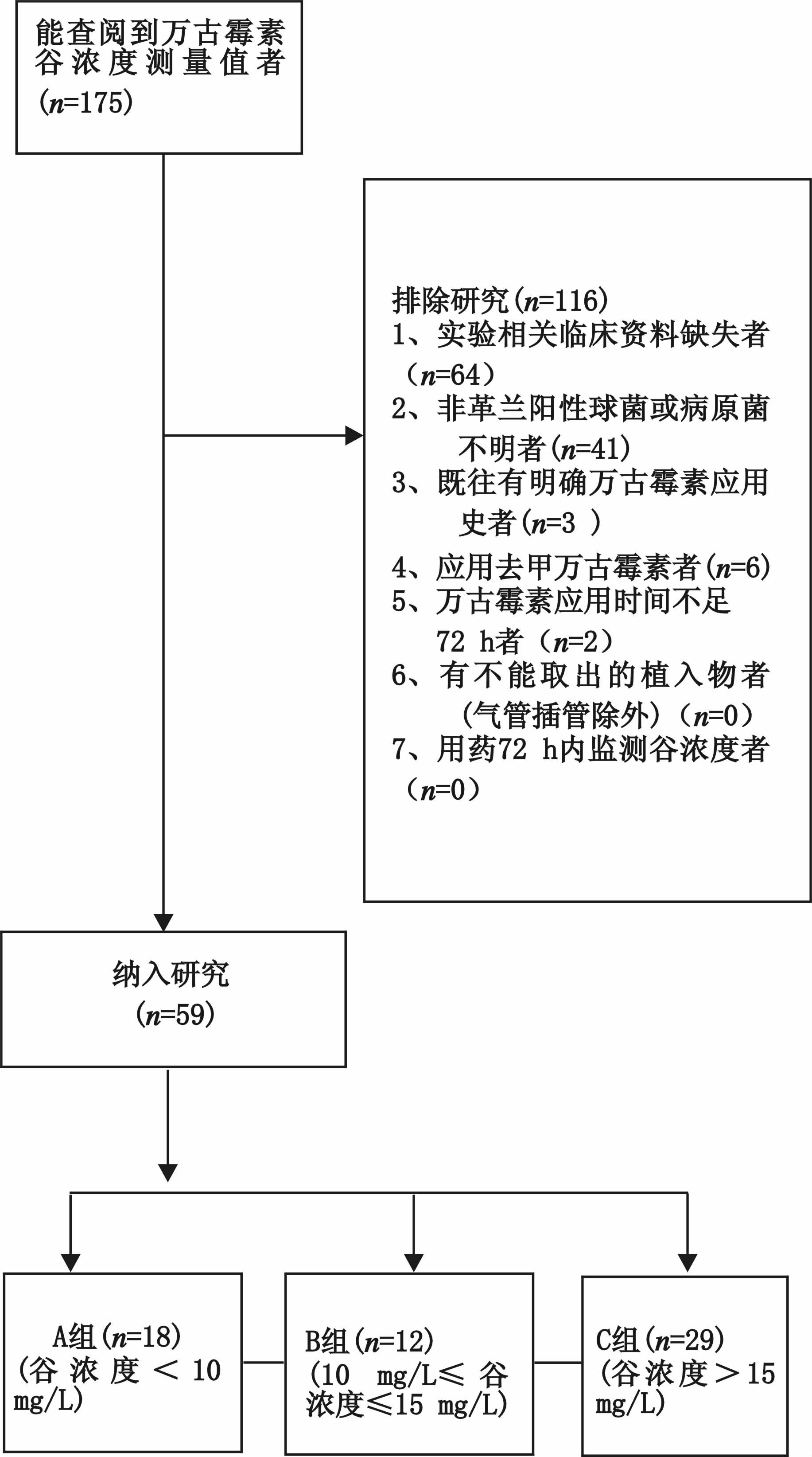 1 资料与方法 1.1 一般资料对2009年1月至2013年12月于北京大学第一医院完善万古霉素谷浓度检查的175例患者按以下标准进行筛选。入组标准:(1)病原学为革兰阳性球菌;(2)静脉滴注万古霉素≥72 h;(3)至少有一个谷浓度测定值;排除标准:(1)实验相关临床资料缺失者;(2)既往明确应用万古霉素抗感染治疗者;(3)有不能取出的植入物者(气管插管除外);(4)用药72 h内监测谷浓度者。见流程图 1。