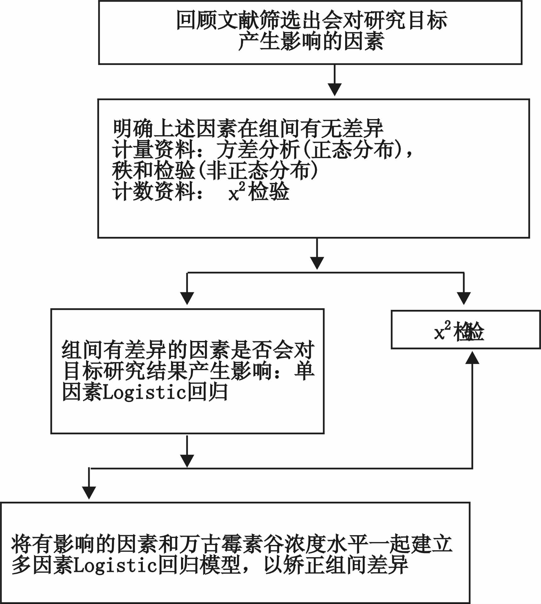 1.3 统计学方法应用SPSS 17.0软件进行统计分析。对于计量资料采用方差分析(正态分布)或秩和检验(非正态分布),对于计数资料采用χ2检验,比较三组间可能会对研究目标产生影响因素的差异。对上述有差异的因素进行单因素Logistic回归分析,明确是否对研究目标产生影响。如组间无对研究目标产生影响的因素的差异,则进行χ2检验;否则,该差异因素将和万古霉素谷浓度水平一起建立多因素Logistic回归模型,以矫正组间差异。以P<0.05为差异有统计学意义。见图 2。