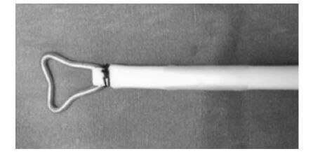 | 图 1 自制宫颈支架 宫腔型节育器下连接18号硅胶导尿管,节育器放置在宫腔内可起到固定防脱落作用,硅胶尿管放在成形宫颈管内起到支撑宫颈管以防发生粘连、狭窄和闭锁 |