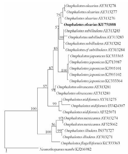 | 图 2 基于ITS序列构建的发光类脐菇的系统发育树(黑体突出显示的为事件标本序列) Fig. 2 Phylogenetic tree of omphalotus olearius based on ITS dataset(Sequence from poisoning case specimen was in bold) |