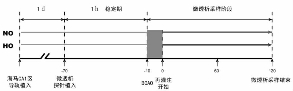 1 材料与方法 1.1 建立全脑缺血-再灌注动物模型及脑立体定位微透析普通级雄性长爪沙鼠,体质量70~95 g,由首都医科大学实验动物中心提供。10%水合氯醛(体质量0.3 mL/100 g)腹腔注射麻醉,脑立体定位仪确定右侧海马CA1坐标(前囟后2 mm,旁开2 mm,硬脑膜下2.5 mm),钻取直径2 mm骨窗,垂直插入微透析导轨(CMA公司,瑞典),骨水泥固定导轨及覆盖颅骨创面。术后恢复1 d,观察实验动物无行为、功能异常。再次固定麻醉,CMA/12(滤过膜长度 3 mm,OD 500 nm,截断值 20 000 Da)探针置换探针导轨(稳定1 h),颈前正中切皮,分离双侧颈总动脉,无创微动脉(1 cm)夹阻断10 min后再次开放,建立全脑缺血-再灌注模型。经口气管插管机械通气,标准定容模式,VT 2.5 mL,F 70次/min,I∶ E=1∶ 1,FIO2:30%;随机数字法分2组并调整FIO2:常氧治疗组(n=8,NO组,FIO2:30% 2 h)和高氧治疗组(n=8,HO组,FIO2:100% 2 h)。分别于再灌注前后股动脉采血行血气分析;连接CMA微透析系统,含水杨酸钠(5 mmol/L)人工脑脊液连续灌注(20 μL/min),间隔10 min连续采样共13次。实验完毕取脑组织,解剖证实探针植入位置(海马CA1区,位置不正确者弃用)。见图 1。