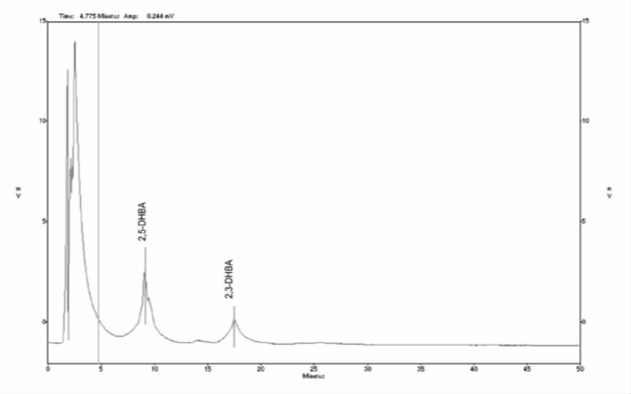 | 图 2 2,3-DHBA和2,5-DHBA的标准色谱图 Fig. 2 The standard chromatogram of 2,3-DHBA and 2,5-DHBA |