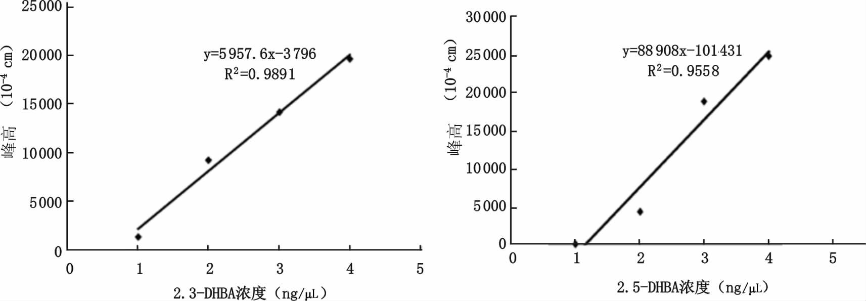 相同色谱条件下,2,3-DHBA和2,5-DHBA标准品含量在1.0~4.0 ng/μL 之间与峰高线性关系良好。见图 3。