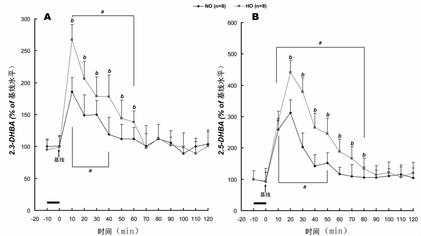 以0 min点(再灌注开始)检测水平作为基础值,各采样时间点水平与基础值比值作为统计研究对象。结果显示,再灌注早期阶段(NO组:10~50 min,HO组10~80 min)2,3-DHBA(A)及2,5-DHBA(B)水平显著高于基础水平 (P<0.05);且HO组较NO组峰值更高(P<0.05),维持时间也相对更长。见图 4。