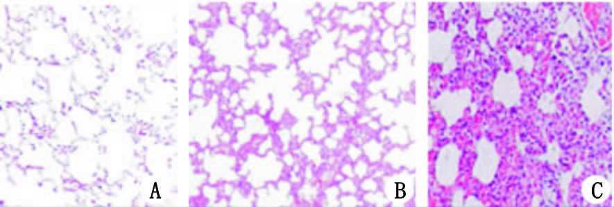 | A:正常组;B:对照组;C:模型组 图 1 24 h 各组小鼠肺组织病理切片(HE×100) |