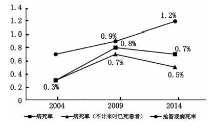| 图 1 2004-2014年间急诊病死率变化趋势 Fig. 1 The trend of ED mortality from 2004 to 2014 |