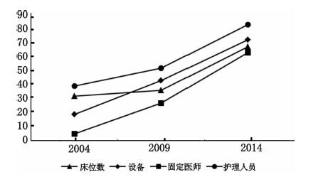 2004-2014年间,本院急诊科医护人员数量和硬件设施配备均有明显提升,如图 2所示。