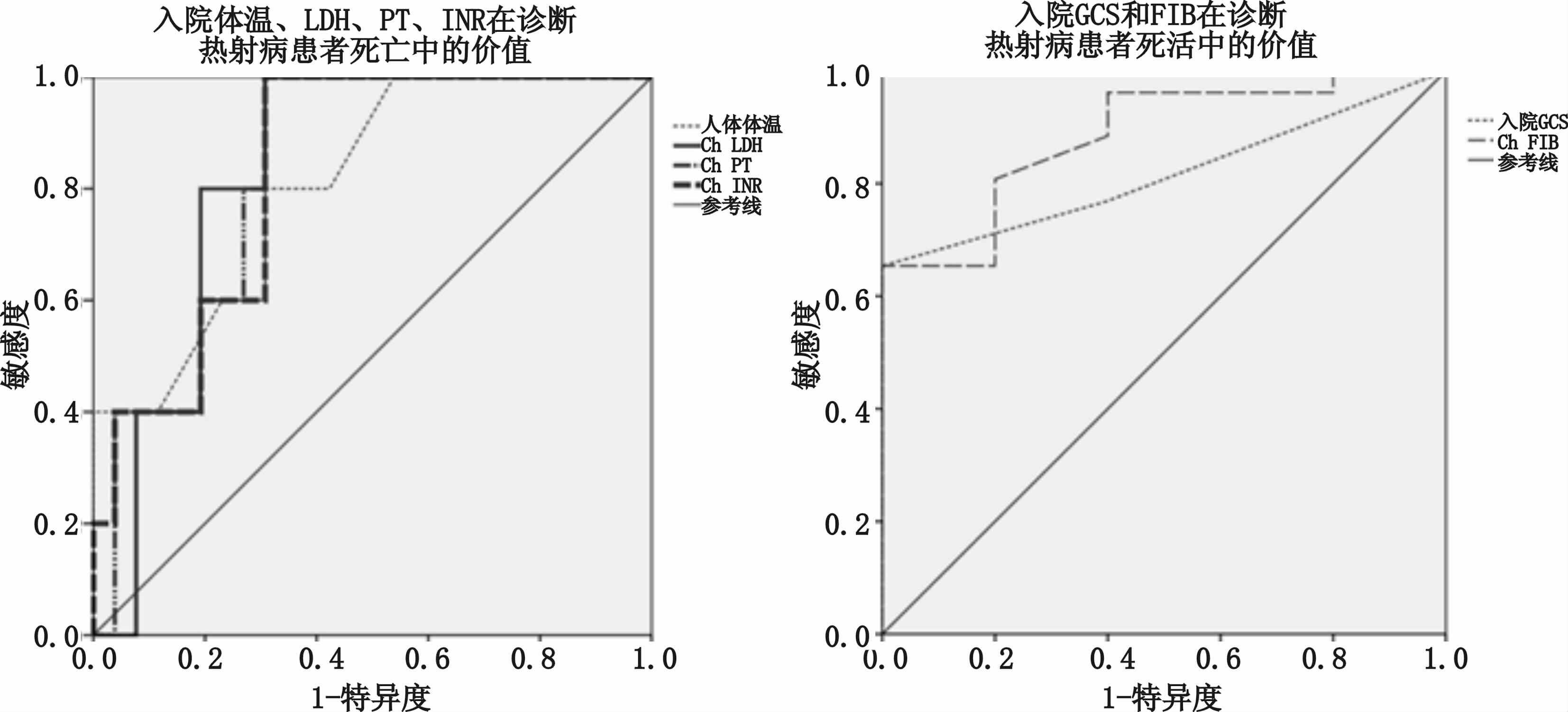 入院体温、乳酸脱氢酶、凝血酶原时间和国际标准化比值在评估热射病患者死亡中的ROC曲线下面积(95%CI)分别是0.808(0.617~0.998)、0.831(0.686~0.975)、0.831(0.679~0.982)和0.831(0.673~0.989),最佳诊断界值分别是38.65 ℃、892 U/L、16.7 s和1.445(见表 3图 1)。入院格拉斯哥(GCS)评分和纤维蛋白原(FIB)在评估热射病患者存活中的ROC曲线下面积(95%CI)分别是0.815(0.664~0.967)和0.885(0.746~1.00),最佳诊断界值分别是4.5分和2.11 g/L见表 4图 1。APACHE Ⅱ评分、24 h体温、24 h体温下降幅度、CPK、乳酸、肌酐和APTT在预测热射病患者死亡中的价值不高(曲线下面积皆小于0.800,见表 3)。