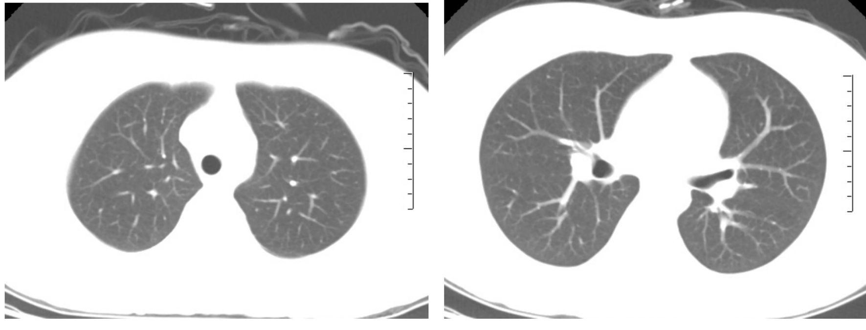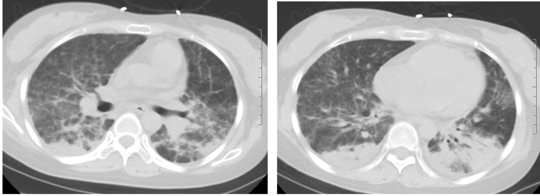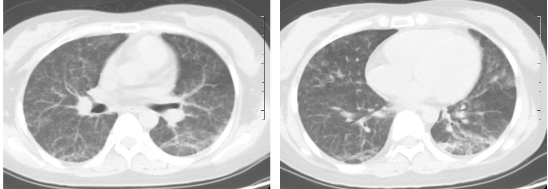 患者,女,24岁,主因“发热、干咳20余天”入院。外院抗生素治疗效果差。既往肾病综合征,口服激素。查体:T 38 ℃、P 105次/min,RR 20次/min,BP 102/73 mmHg(1 mmHg=0.133 kPa),双肺未闻及啰音。辅助检查:WBC 1.52× 109 L-1、NE 78.3%;CRP 71 mg/L;ALT 248 U/L、AST 118 U/L;动脉血气(未吸氧):pH 7.44,PaCO2 34 mmHg,PaO2 69 mmHg;胸部平片未见异常。入院后美罗培南治疗3 d,未见好转,呼吸困难进行性加重,I型呼吸衰竭。第3日胸部CT提示双肺间质弥漫渗出,部分实变(图 1),病原不明确,调整抗感染方案:美罗培南、莫西沙星、磺胺、卡泊芬净、更昔洛韦250 mg/12 h、甲强龙40 mg/d、丙种球蛋白。第6日症状明显好转,复查胸部CT较前明显吸收(图 2),此时回报PCT、血培养、G试验、GM试验、呼吸道病原菌培养均阴性;CD4、CD8及CD4/CD8显著下降;肺泡灌洗液CMV-DNA 9.4×105 拷贝/mL,血清CMV-DNA 4.35×104 拷贝/mL,考虑巨细胞病毒肺炎诊断明确,维持更昔洛韦、甲强龙治疗3周,1月后胸部CT示渗出及实变完全吸收(如图 3)。