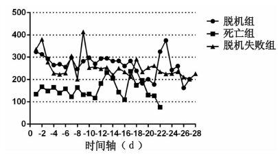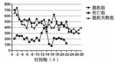 将患者入院作为-28 d,观察结束时间定为第0天,做出患者各项指标变化的趋势图。三组患者氧合指数趋势分析见图 1。脱机组氧合随时间趋于好转,死亡组则在低位徘徊,脱机失败组出现较大的震荡。三组患者“弥散指数”趋势分析在各组间与氧合指数一致,见图 2。脱机组“弥散指数”与氧合指数比较,见图 3。