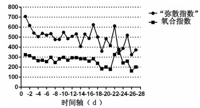 由图 3中分别描记的“弥散指数”与氧合指数随时间变化趋势的折线图可以看出,二者总体变化趋势相似,但随着时间上越来越接近脱机的时间点,“弥散指数”上升的趋势变化更为明显,因此有必要分析其二者的差异程度。