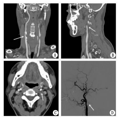 图 1 患者颈动脉支架植入术前颈动脉CTA(A、B、C)及术中左侧颈动脉DSA血管造影(D)