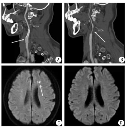 图 2 患者颈动脉支架植入术后复查颈动脉CTA(A、B),术后头颅MRI弥散加权图像(DWI)(C),术前同一患者头颅MRI弥散加权图像(DWI)(D)