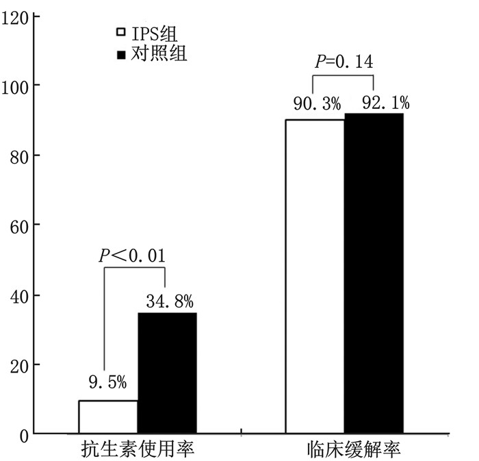 SIPS组抗生素使用率显著低于对照组(P<0.01)。临床缓解率在SIPS组和对照组差异无统计学意义。具体结果见图 1