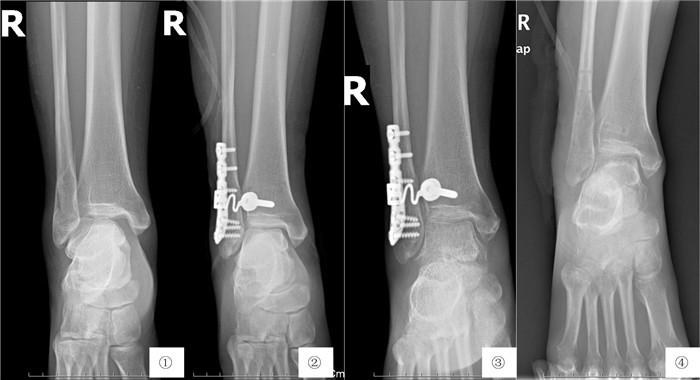 | 图 2 ①术前右侧踝关节正位X线片;②术后2 d右侧踝关节正位X线片;③术后3月右侧踝关节正位X线片;④术后1年内固定取出后右侧踝关节正位X线片 |