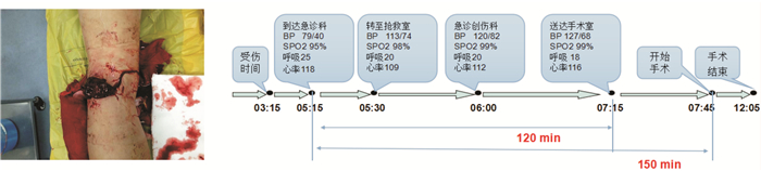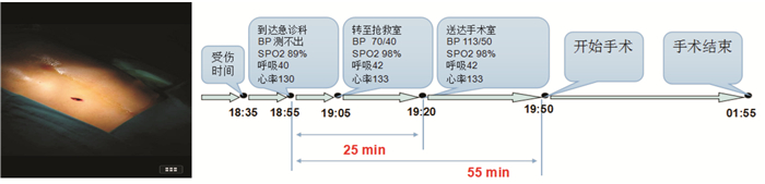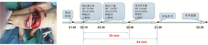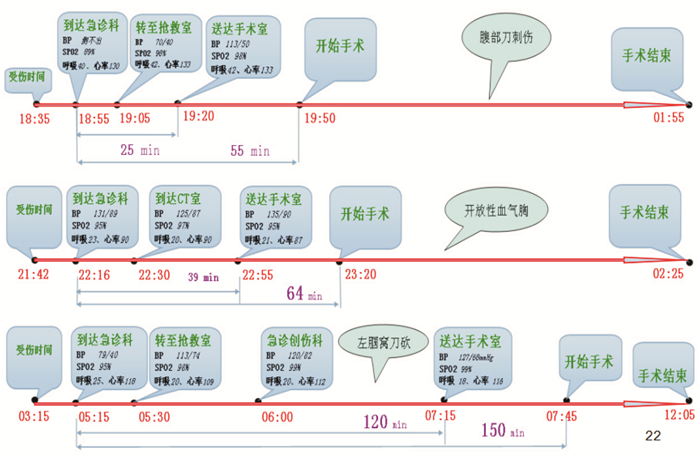 例1:腹部刀刺伤,肝、十二指肠、下腔静脉破裂,失血性休克。患者从到达急诊科至送达手术室用时25 min,从到达急诊科至开始手术用时55 min,该患者预后良好。见图 1。例2:胸背部切割伤、开放性血气胸。患者从到达急诊科至送达手术室用时39 min,从到达急诊科至开始手术用时64 min,患者预后良好。见图 2。例3:左腘窝刀砍伤、失血性休克。从到达急诊科至送达手术室用时120 min,从到达急诊科至开始手术用时150 min,该患者预后很差。见图 3。通过对比,其实不难发现,导致三例患者预后不同的就是急诊这个链条是否环环相扣,是否建立了无缝隙的紧急医疗体系,是否在诊治各环节衔接上浪费时间。见图 4。