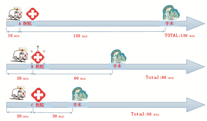 假设,从某事故发生地到A医院需要10 min车程,到B医院需要20 min,到C医院也需要20 min,此时如果您是患者本人或家属,毫无疑问,A医院必然是首选。可是,A医院从接诊到开始手术需要2 h,B医院需要1 h,而C医院只需要0.5 h,用时间线(Time Line)的形式(图 4)。