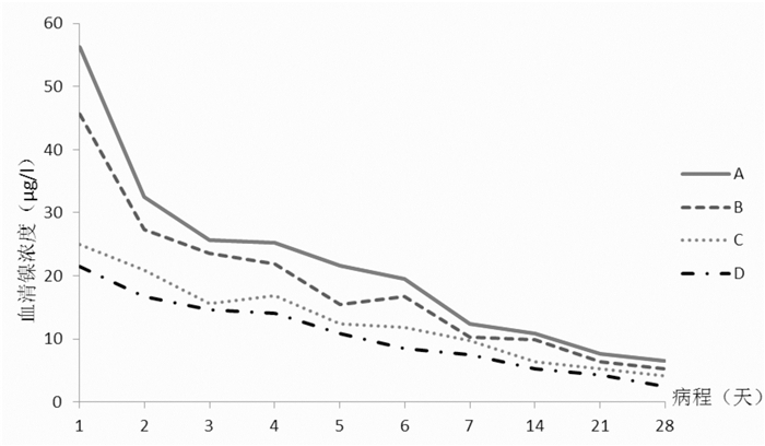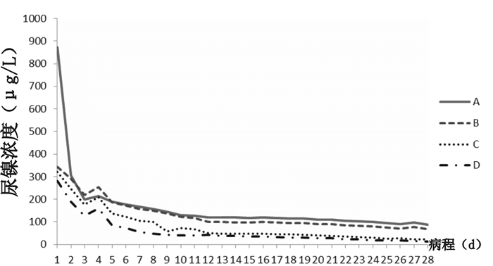 正常人血清镍浓度为0.2 μg/L,尿镍浓度为1~3 μg/L。患者病情越重,血清、尿镍浓度越高。患者在入院时血清、尿镍浓度达到峰值,随后浓度逐渐下降。第28天时仍高于正常(图 12)。