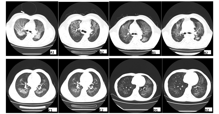 A1、A2为A患者治疗前后比较;B1、B2为B患者治疗前后比较;C1、C2为C患者治疗前后比较;D1、D2为D患者治疗前后比较 图 3 4例患者胸部CT表现 Figure 3 CT appearance of lung of patients