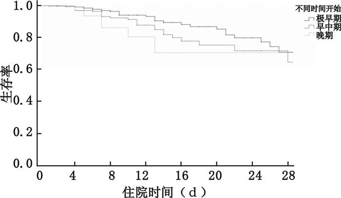 按照不同时间开始营养治疗,可将患者分成极早期组(24 h)、早中期组(24~72 h)和晚期组(>72 h)。三组患者的性别,年龄均差异无统计学意义。极早期组患者有399例,住院病死率为7.0%(28例死亡);早中期组患者有211例,住院病死率为12.8%(27例死亡);晚期组患者有31例,住院病死率为19.4%(6例死亡)。此外,41例患者1周内未行营养治疗,住院病死率为19.5%(8例死亡)。经χ2检验,三组患者的住院病死率差异有统计学意义,χ2=9.01,P=0.011。其中,极早期开始营养治疗的患者住院病死率最低,与其他两组患者比较,差异有统计学意义,χ2=5.62和6.01,P=0.018和0.014。早中期组和晚期组患者住院病死率差异无统计学意义,χ2=0.99,P=0.32。图 1描述了不同时间开始营养治疗的患者28 d住院生存情况,经Log-Rank检验,极早期与另外两组患者的生存曲线存在差异,χ2=4.00和3.30,P=0.045和0.039。
