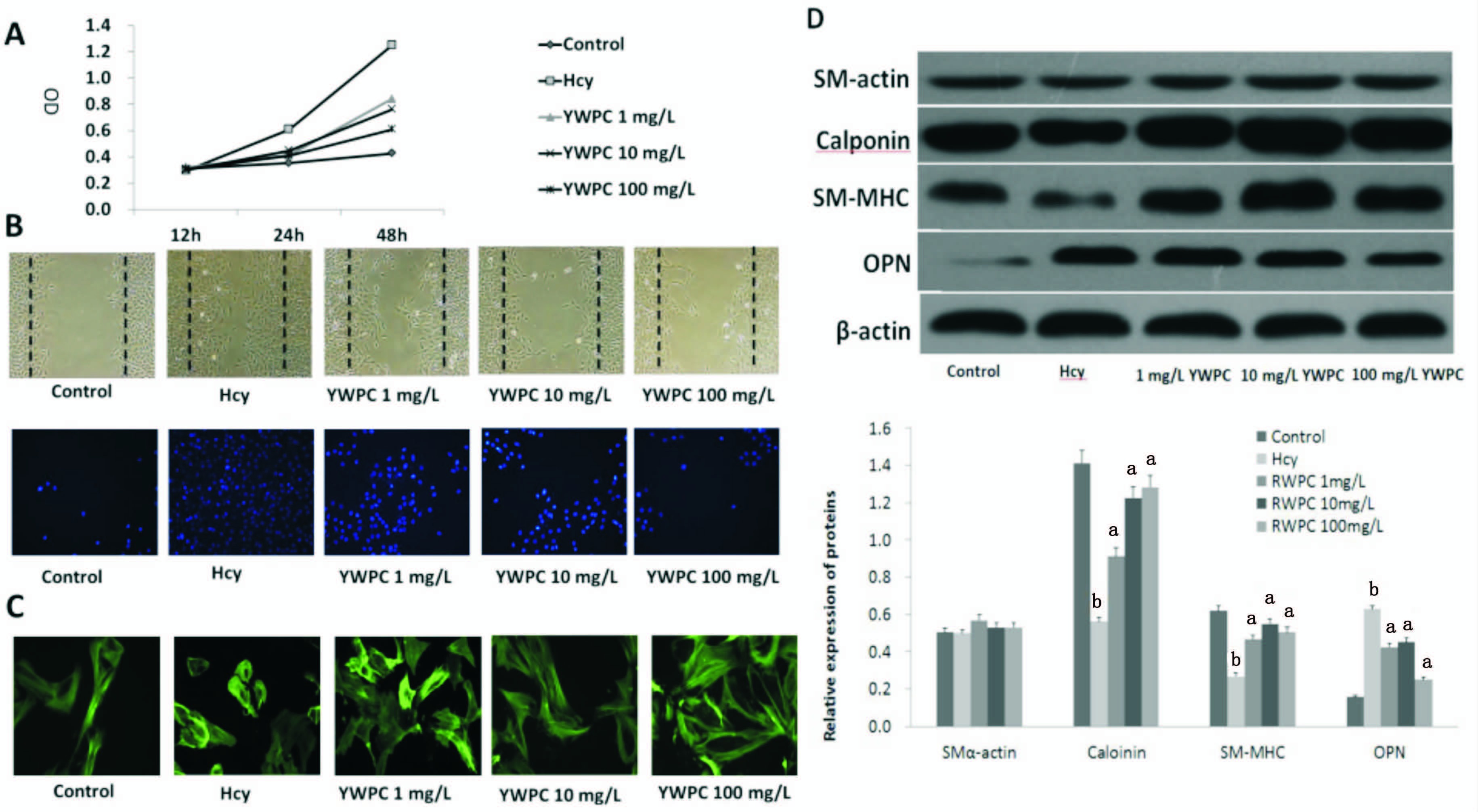 A:不同浓度黄酒多酚对VSMCs增殖的影响;B:不同浓度黄酒多酚对VSMCs迁移的影响;C:不同浓度黄酒多酚对VSMCs形态的影响;D:不同浓度黄酒多酚对SM-actin、calponin、SM-MHC、OPN表达的影响;与Control组比较,aP<0.01; 与Hcy组比较,bP<0.01;Hcy: 同型半胱氨酸; YWPC: 黄酒多酚 图 2 黄酒多酚抑制血管平滑肌细胞去分化