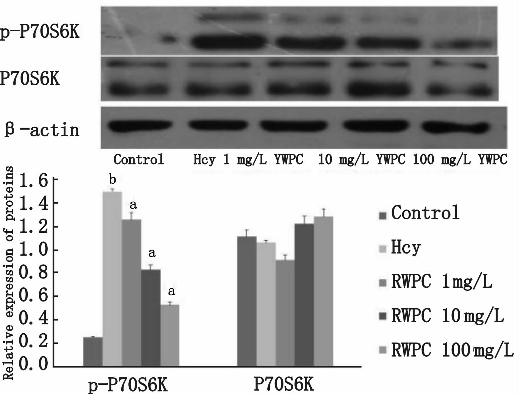 与Control组比较,aP<0.01; 与Hcy组比较,bP<0.01;Hcy: 同型半胱氨酸; YWPC: 黄酒多酚 图 3 Western blot 检测各组VSMCs中P70S6K和p-P70S6K的表达