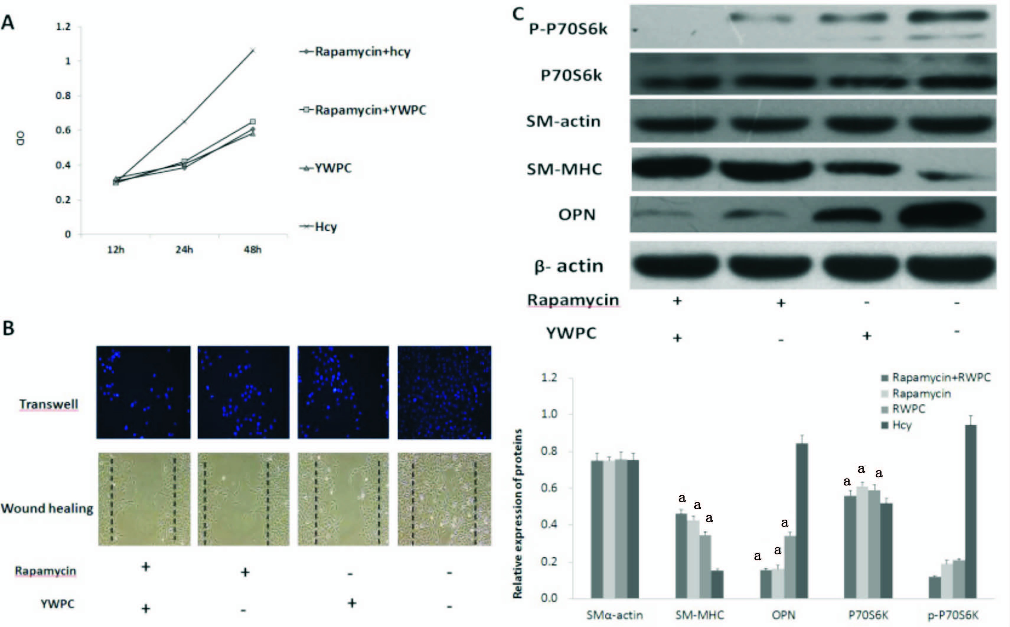 A:黄酒多酚和雷帕霉素对VSMCs增殖的影响;B:黄酒多酚和雷帕霉素对VSMCs迁移的影响:C:黄酒多酚和雷帕霉素对P-P70S6K、P70S6K、SM-actin、SM-MHC、OPN表达的影响;Hcy: 同型半胱氨酸; YWPC: 黄酒多酚;与Hcy组比较,aP<0.01 图 4 雷帕霉素抑制VSMCs去分化
