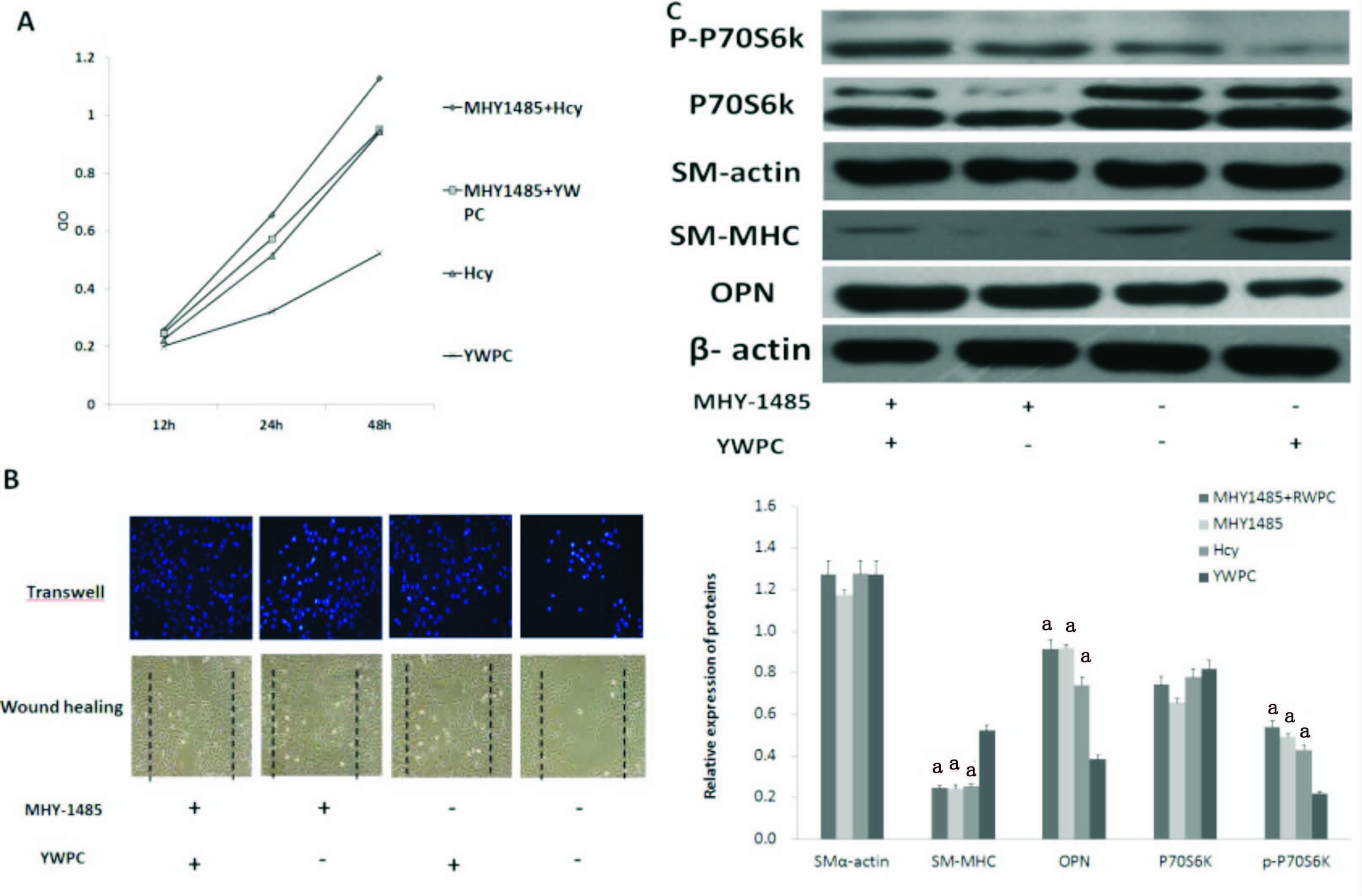A:黄酒多酚和MHY-1485对VSMCs增殖的影响;B:黄酒多酚和MHY-1485对VSMCs迁移的影响:C:黄酒多酚和MHY-1485对P-P70S6K、P70S6K、SM-actin、SM-MHC、OPN表达的影响;Hcy: 同型半胱氨酸; YWPC: 黄酒多酚;与黄酒多酚组比较,aP<0.01 图 5 MHY-1485促进VSMCs去分化