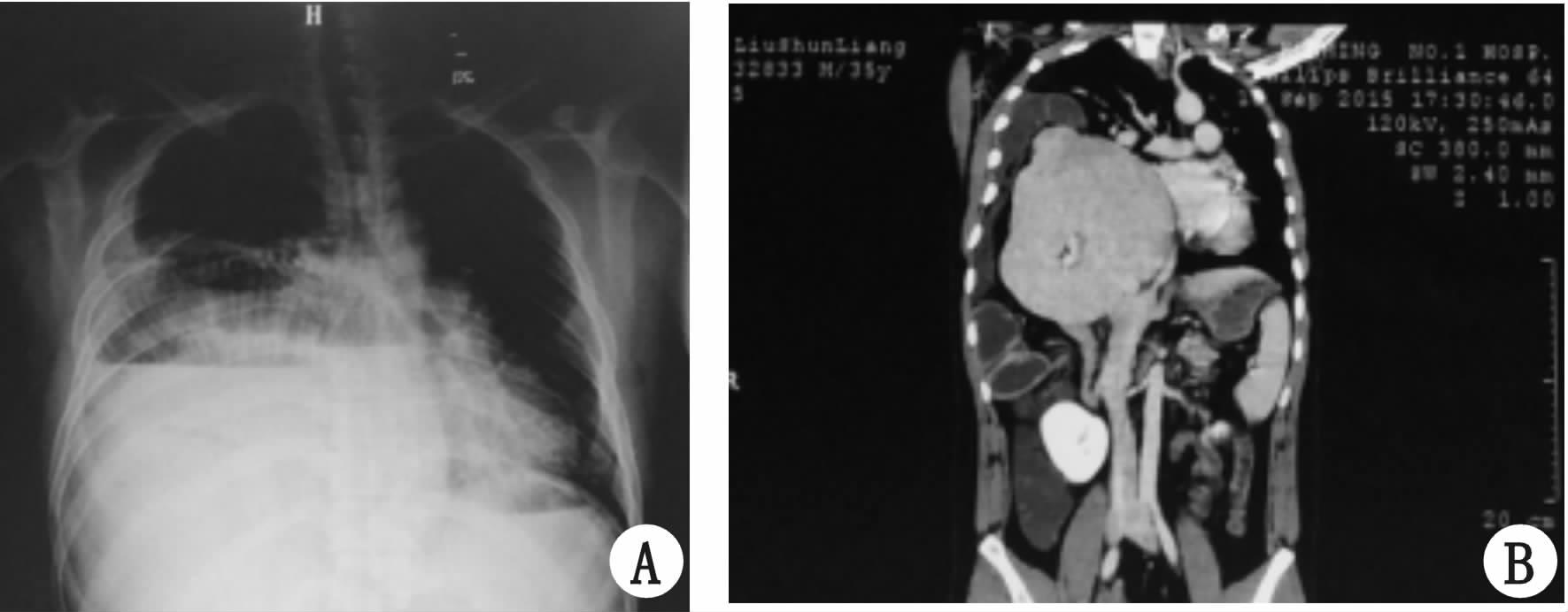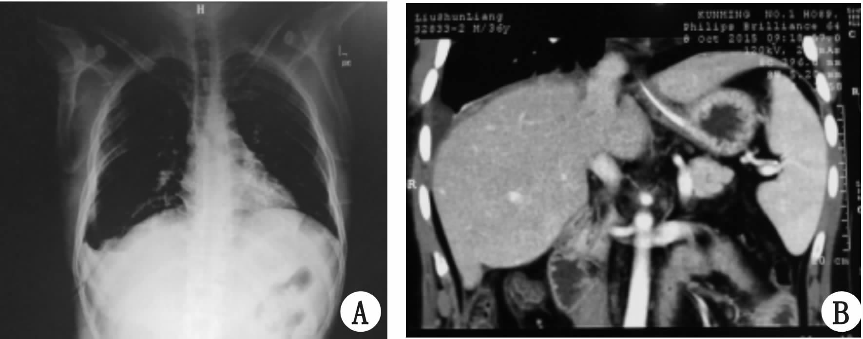 患者男性,35岁,就诊前12 h夜间睡觉时无明显诱因突发右上腹部疼痛不适入院,期间感胸闷,平卧时呼吸困难,无呕吐,腹痛前短期内无剧烈撞击史,15年前高空坠落后致胸部闭合性多发伤,血气胸,曾行右侧胸腔闭式引流。入院查体:呼吸浅快,右肺呼吸音未闻及,语颤减弱,腹软,右上腹空虚,剑突下及右侧中上腹部压痛、轻反跳痛伴肌紧张,肝浊音界上移,肠鸣音弱,2 min未闻及。入院急诊胸片示,右侧膈面升高,右肺压缩,膈疝可能(图 1A)。CT示右侧上中腹内横结肠及升结肠肠梗阻表现,并右侧膈肌抬升,右侧胸腔可见肠管影,肝脏位置上移、右肺膨胀不全,纵膈左偏,右肺压缩约80%(图 1B)。诊断为:肠梗阻,膈疝,遂急诊行剖腹探查术。
