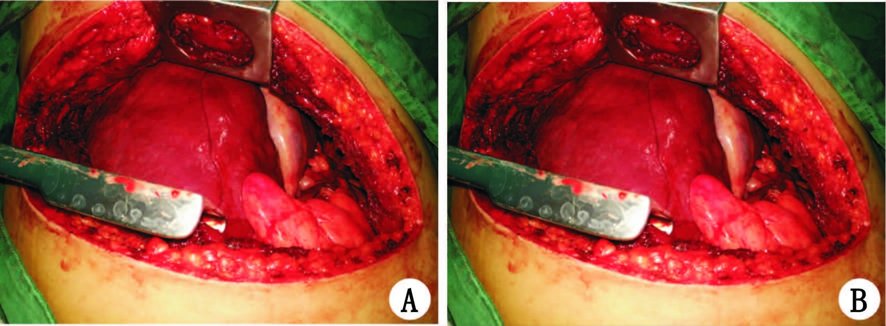 图 2 术中右胸探查(A)和回纳肝脏(B)图片