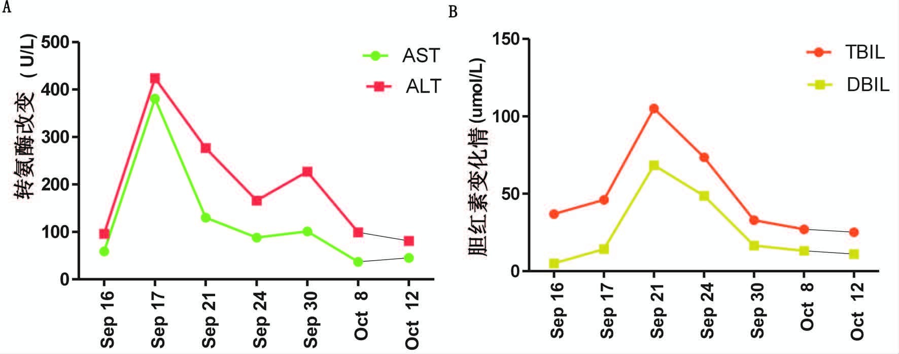 图 4 术前和术后转氨酶(A)及胆红素(B)变化情况