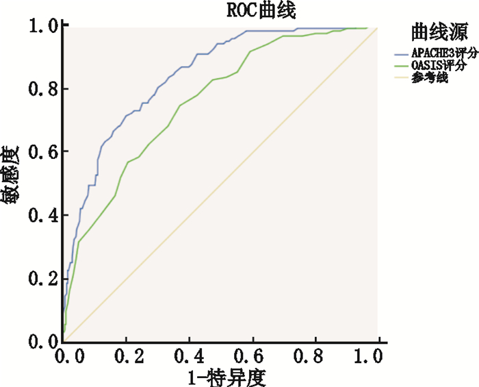 图 1 OASIS和APACH Ⅲ评分ROC曲线 Figure 1 Comparison of the area under the receiver operating characteristic curves (AUC) of Oxford Acute Severity of Illness Score (OASIS) and APACH Ⅲ