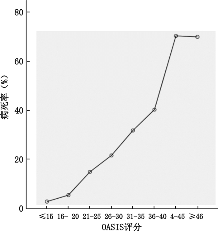 随着OASIS评分分数的增加,患者的病死率逐渐上升,双变量相关分析显示,Spearman相关系数rs=0.976,(P < 0.01)。见表 3图 2