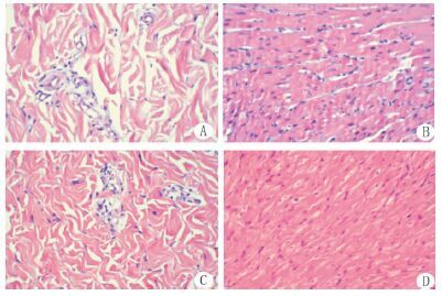 | A:低阻抗组皮肤组织; B:低阻抗组心肌组织;C:高阻抗组皮肤组织; D:高阻抗组心肌组织 图 1 两组动物皮肤和心肌组织病理学表现(HE×200) Figure 1 Pathologic findings of skin and cardiac tissue in two groups(HE×200) |