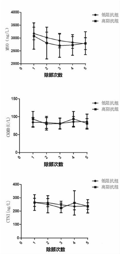 如图 2所示,两组之间心肌酶(MYO, CKMB和CTNI)差异均无统计学意义(P>0.05) 。