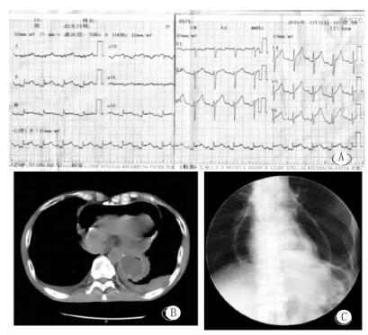 A:心电图示 Ⅱ、Ⅲ、aVF、V4-V6导联 ST段抬高; B:胸部CT检查示,食管癌术后,心包积气,双侧胸腔积液,右上肺斑片影;C:上消化道碘油造影示,心包积气,食管癌术后,吻合口正常 图 1 患者入院心电图(A)、急诊胸部CT(B)和上消化道碘油造影(C)结果