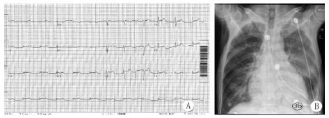 A:心电图示:非阵发性交界性心动过速,Ⅱ、Ⅲ、aVF、V4-V6 导联ST抬高0.1 mV;B:床边全胸片示两肺渗出性病变,左侧胸腔积液 图 3 患者复查心电图和全胸片结果