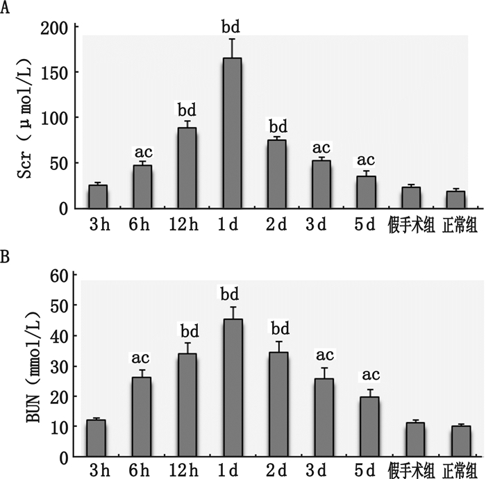 | 与假手术组相比较,aP < 0.05,bP < 0.01;与正常组相比,cP < 0.05,dP < 0.01 图 1 各组小鼠CLP术后各时间点Scr和BUN的变化 Figure 1 The variation of Scr and BUN after CLP between different mice group |
