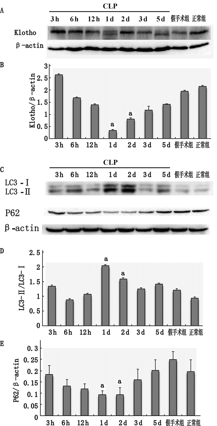 CLP术后,与假手术组和正常组相比,Klotho蛋白浓度从3 h开始逐渐变淡,至1 d时达最低值,2 d时有所恢复,然后逐渐转浓。自噬相关蛋白包括LC3和P62,其变化趋势也有时间依赖性。LC3-Ⅱ从3 h开始逐渐增浓,至1 d时达峰值,2 d时有所下降,然后逐渐变淡,而P62与LC3-Ⅱ变化相反,更进一步支持自噬的激活作用,在1 d这个时间点最显著 (图 2)。